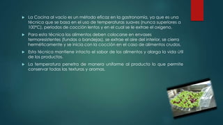 La cocina al vacío es una técnica que implica colocar los alimentos en envases herméticos, extraer el aire del interior, cocinar a temperaturas suaves de 65°C a 100°C, y enfriar rápidamente para preservar los sabores, texturas y prolongar la vida útil de los productos. Esta técnica mantiene los sabores intactos y la temperatura penetra de manera uniforme para conservar las propiedades de los alimentos.