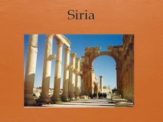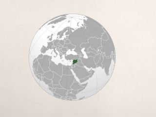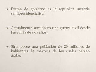 Siria es una república unitaria semipresidencialista sumida en una guerra civil desde hace más de dos años. La mayoría de los más de 20 millones de habitantes son musulmanes sunnitas y hablan árabe. Siria ha estado gobernada por varios imperios a lo largo de la historia y obtuvo su independencia en 1946. La economía se basa en la agricultura, la ganadería y la industria petrolera.