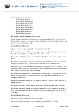 La gastronomía de América Central se caracteriza por la fusión de las cocinas indígenas, africanas y españolas. Los ingredientes principales incluyen el maíz, frijoles, arroz, carne de cerdo y pollo. Platos típicos varian entre países pero incluyen tamales, pupusas y platos con maíz, frijoles, arroz, carne y mariscos. Cada país tiene platos y bebidas tradicionales influenciados por sus culturas e ingredientes regionales.