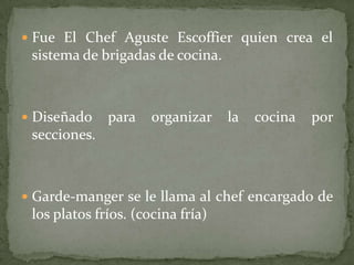 El chef Aguste Escoffier creó el sistema de brigadas de cocina para organizar la cocina por secciones. Una de estas secciones es la cocina fría, encargada de platos que requieren poca o ninguna cocción, como ensaladas, sándwiches y carnes frías.