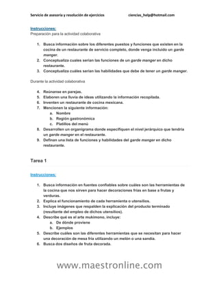 Este documento presenta una serie de instrucciones para actividades colaborativas y tareas individuales relacionadas con la cocina fría y la charcutería. Se pide a los estudiantes que investiguen sobre diferentes temas como las funciones de un garde manger, quesos, embutidos, decoración de frutas y verduras, gelatinas y sándwiches. Las actividades colaborativas incluyen diseñar menús y catálogos de quesos, preparar botanas frías y postres con salsas.