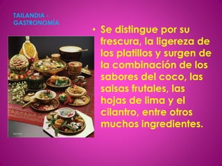 La cocina tailandesa se caracteriza por la mezcla de cinco sabores fundamentales y el uso del arroz como ingrediente principal. Deriva de influencias asiáticas como la japonesa, india e indonesia. Algunos platillos típicos incluyen el curry, disponible en versiones amarilla, verde y roja, y el pad thai, fideos fritos acompañados de verduras. El arroz, las verduras y las carnes como pollo y cerdo se preparan de diversas formas usando técnicas como hervir,