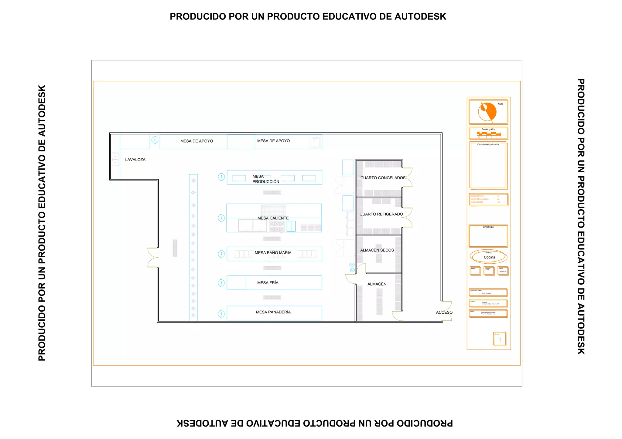 El documento presenta un plano de cocina que incluye un cuarto refrigerado, cuarto congelados, mesa de apoyo, mesa caliente, mesa, mesa de apoyo y lavaplatos. El plano muestra las superficies total, construida y libre de la cocina en metros cuadrados.