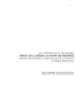Este documento presenta una introducción a la gran cocina peruana. Explica que la cocina peruana es el resultado de la convergencia de sabores prehispánicos con la cocina española, italiana, china y japonesa. Destaca platos típicos como el ceviche y menciona que ofrece más de 50 versiones de este plato. También resalta otros populares como el cau cau y el arroz con pato. Finaliza invitando al lector a explorar la rica gastronomía peruana a través de las recet