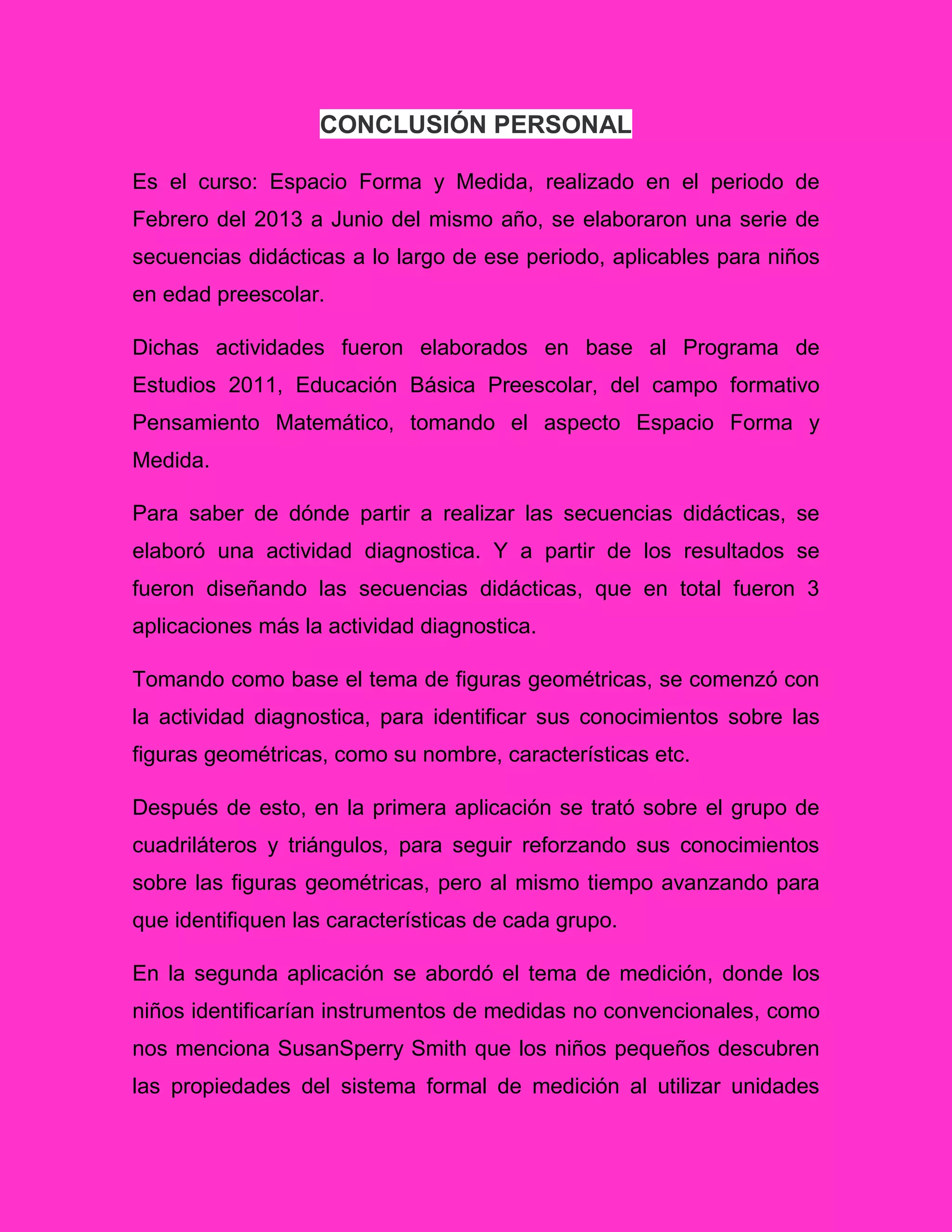 Este documento resume las conclusiones de un curso sobre espacio, forma y medida para niños en edad preescolar. Se diseñaron varias secuencias didácticas aplicando actividades diagnósticas iniciales. Las secuencias cubrieron temas como figuras geométricas, medición, tiempo y peso. Cada actividad consideró factores como el nivel de razonamiento de los niños, el diseño de materiales interactivos y un ambiente propicio para el aprendizaje. El autor concluye que reflexionar sobre las aplicaciones ayuda a mejorar el desemp
