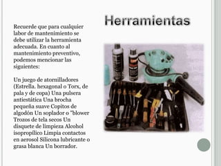 Para realizar el mantenimiento preventivo de un sistema de cómputo, se recomienda tener las siguientes herramientas: juegos de atornilladores, pulsera antiestática, brocha, copos de algodón, soplador, tela seca, disquete de limpieza, alcohol isopropílico, limpia contactos y silicona lubricante. También es importante desconectar todos los cables y periféricos antes de abrir la unidad central y retirar las tarjetas con cuidado.