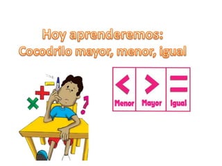 El documento presenta una serie de actividades matemáticas para determinar si un número es mayor, menor o igual que otro número. Los estudiantes deben realizar los signos matemáticos correspondientes y explicar cómo determinaron la respuesta analizando los números. Roberto el cocodrilo supervisará si los niños han aprendido a realizar correctamente estas comparaciones numéricas.