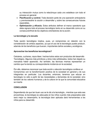 El documento aborda la importancia de comprender la tecnología desde una perspectiva histórico-social y cultural, destacando su impacto en la sociedad actual. Se analizan características fundamentales de la tecnología, como la racionalidad, claridad y sistematización, y se enfatiza la necesidad de educar en tecnología considerando tanto sus beneficios como sus potenciales daños sociales. Finalmente, se concluye que el uso adecuado de la tecnología puede contribuir al desarrollo positivo de los niños y al entorno educativo.