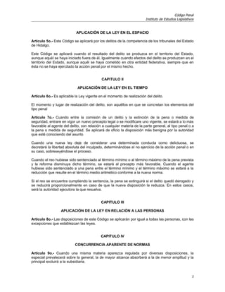 Este documento presenta extractos del Código Penal para el Estado de Hidalgo en México. Incluye secciones sobre la aplicación de la ley en el espacio y el tiempo, la clasificación de delitos, la autoría y participación, entre otros principios generales. El Código establece las leyes penales y los procedimientos legales para juzgar crímenes dentro del estado de Hidalgo.