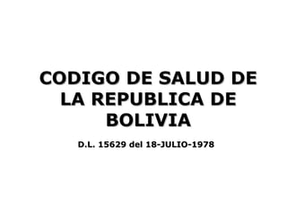 Este documento presenta el Código de Salud de la República de Bolivia de 1978. Establece que la finalidad del código es regular las acciones para la conservación, mejoramiento y restauración de la salud de la población mediante el control del comportamiento humano y ciertas actividades. Declara que la salud es un bien de interés público y corresponde al Estado velar por la salud del individuo, la familia y la población. Asigna al Ministerio de Previsión Social y Salud Pública la definición de la política nacional de salud.
