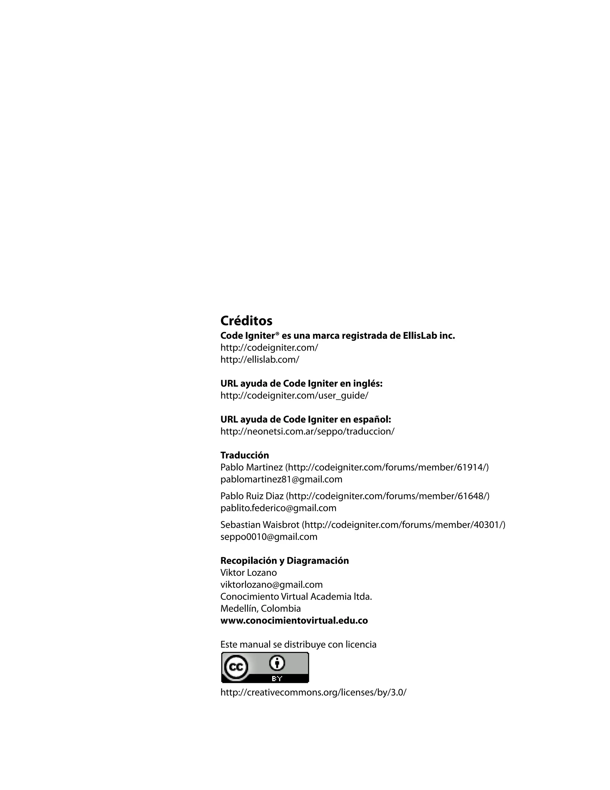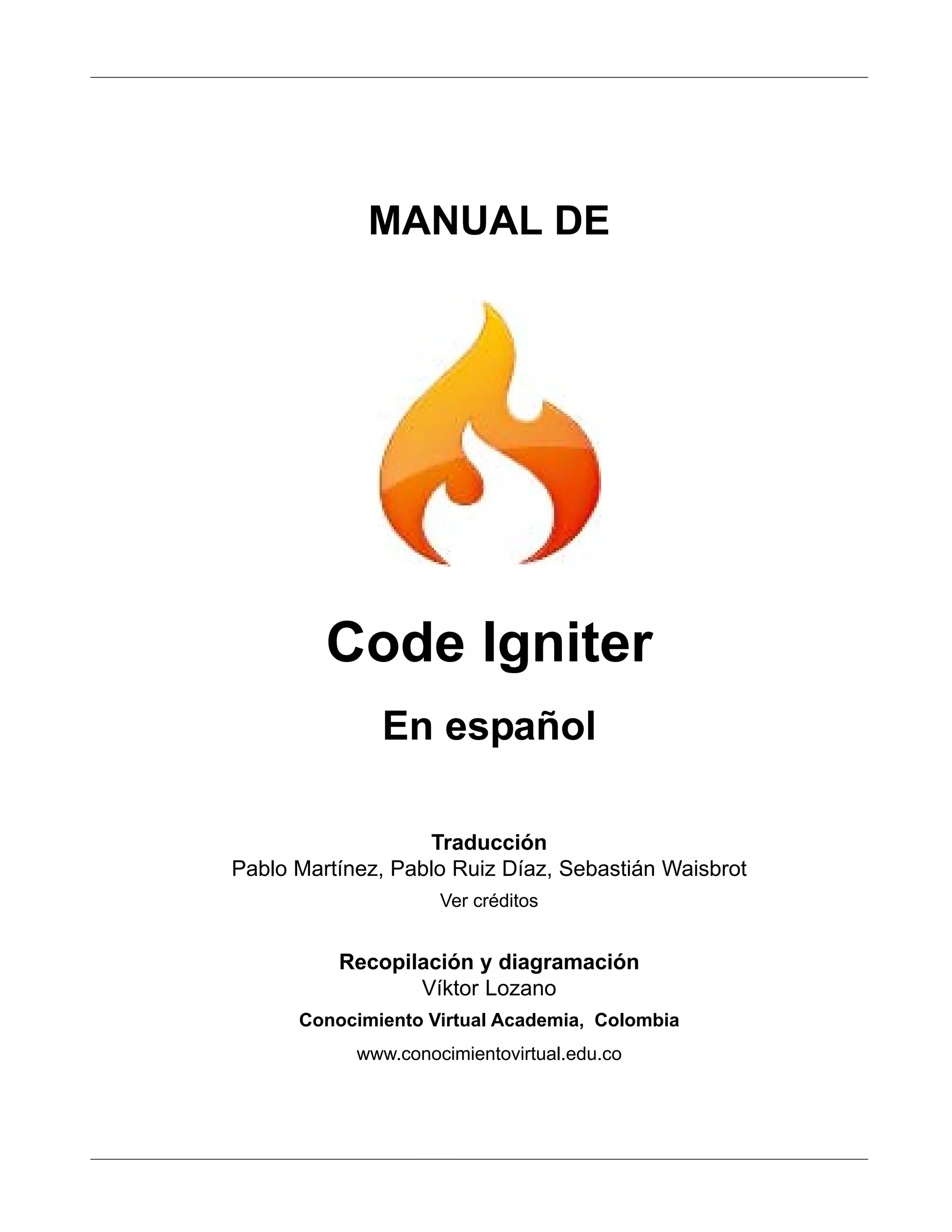 Este manual proporciona información sobre la instalación y uso de CodeIgniter, un framework PHP para desarrollo web ligero y de código abierto. Explica cómo descargar e instalar CodeIgniter, sus características clave como MVC, y proporciona documentación detallada sobre controladores, vistas, modelos y otras herramientas del framework. El manual también incluye referencias de clases detalladas para las clases principales del núcleo de CodeIgniter.