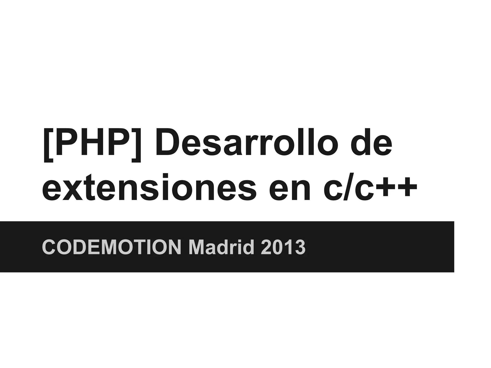 El documento presenta un taller sobre el desarrollo de extensiones de PHP en C/C++ impartido por Daniel González en Codemotion Madrid 2013. Se discuten conceptos clave como la definición de extensiones y su utilidad, junto con ejemplos prácticos de código para la creación de funciones personalizadas. Además, se mencionan recursos y repositorios relevantes para el aprendizaje y desarrollo de extensiones en PHP.
