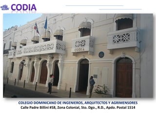 El documento proporciona información sobre el Colegio Dominicano de Ingenieros, Arquitectos y Agrimensores. Fue fundado en 1963 y agrupa a ingenieros, arquitectos y agrimensores en República Dominicana. Tiene como objetivos vigilar el ejercicio profesional de sus miembros, establecer normas técnicas y legales, y fomentar el progreso científico y técnico. Está regido por una Junta Directiva y sus órganos principales son la Asamblea, Junta Directiva