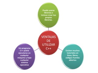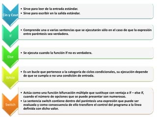 Este documento presenta ejemplos del uso de diferentes funciones y estructuras de control en el lenguaje de programación C++, como printf/scanf, cin/cout, if/else, switch. Incluye problemas y sus respectivas soluciones para hallar la suma de números, verificar tipos de triángulos, y calcular volúmenes usando estas herramientas.