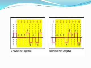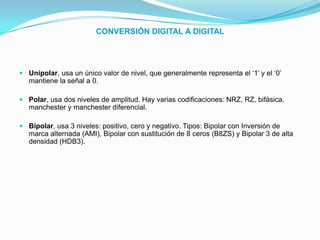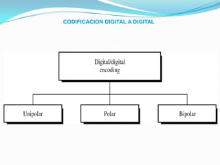 Este documento describe diferentes métodos de codificación digital, incluyendo unipolar, polar y bipolar. La codificación unipolar usa un solo valor de nivel para representar 1s y 0s, mientras que la codificación polar usa dos niveles de amplitud. La codificación bipolar usa tres niveles: positivo, cero y negativo. Se describen varios esquemas de codificación específicos como NRZ, RZ, Manchester y sus variantes.