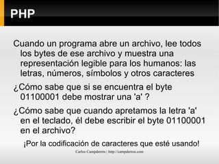 El documento explica cómo las máquinas interpretan caracteres mediante codificaciones como ISO-8859-1 y UTF-8, destacando la limitación de los bytes en representar diversos caracteres. Se enfatiza que UTF-8 es la codificación del futuro debido a su versatilidad y compatibilidad con múltiples idiomas. También se presentan recomendaciones sobre cómo configurar páginas web y bases de datos para asegurar una correcta representación de los caracteres.