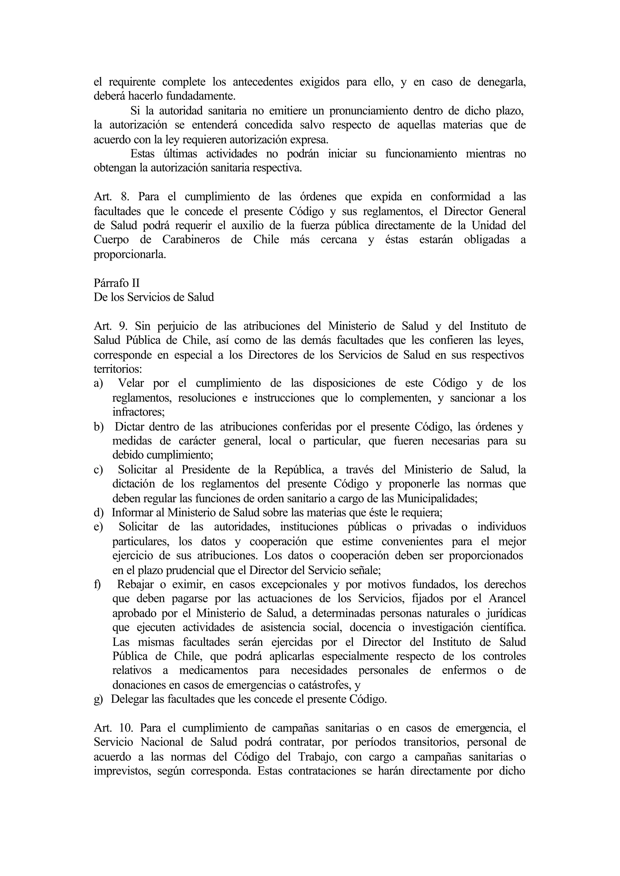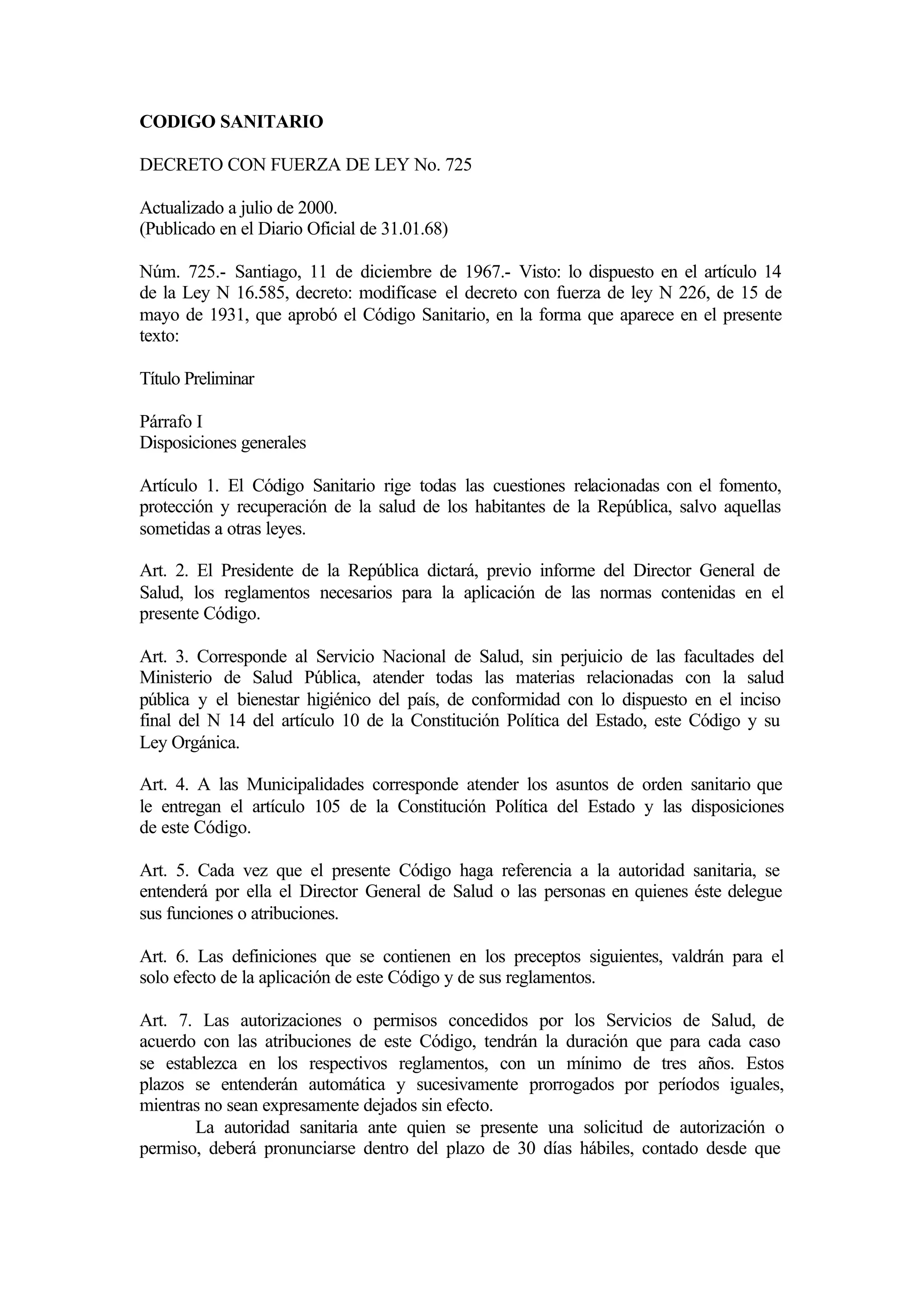 Este documento presenta el Código Sanitario de Chile, decretado en 1967. Establece las atribuciones del Servicio Nacional de Salud y las municipalidades en materias de salud pública e higiene. También define los derechos de las mujeres embarazadas y los niños a recibir protección del estado. El código regula diversos aspectos de la salud pública como la eliminación de residuos, condiciones de limpieza y más.