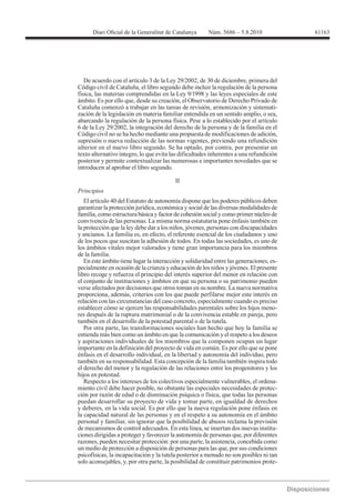 Este documento presenta el Libro Segundo del Código Civil de Cataluña relativo a la persona y la familia. El Libro Segundo regula asuntos como la personalidad civil, la capacidad, la autonomía de la persona en materia de salud, las instituciones de protección de la persona, la familia y otras relaciones de convivencia. El documento explica los principios, estructura y contenido del nuevo Libro Segundo, el cual introduce cambios para adecuar la legislación a las realidades sociales actuales de Cataluña.