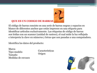 Este documento describe los códigos de barras, incluyendo su historia, tipos, ventajas y factores que pueden causar una mala impresión. Los códigos de barras consisten en barras negras y espacios en blanco que identifican artículos de manera única cuando son escaneados. Existen varios tipos de códigos de barras de una y dos dimensiones que pueden almacenar diferentes cantidades de datos sobre un producto. El uso de códigos de barras proporciona varias ventajas como información más precisa y control de