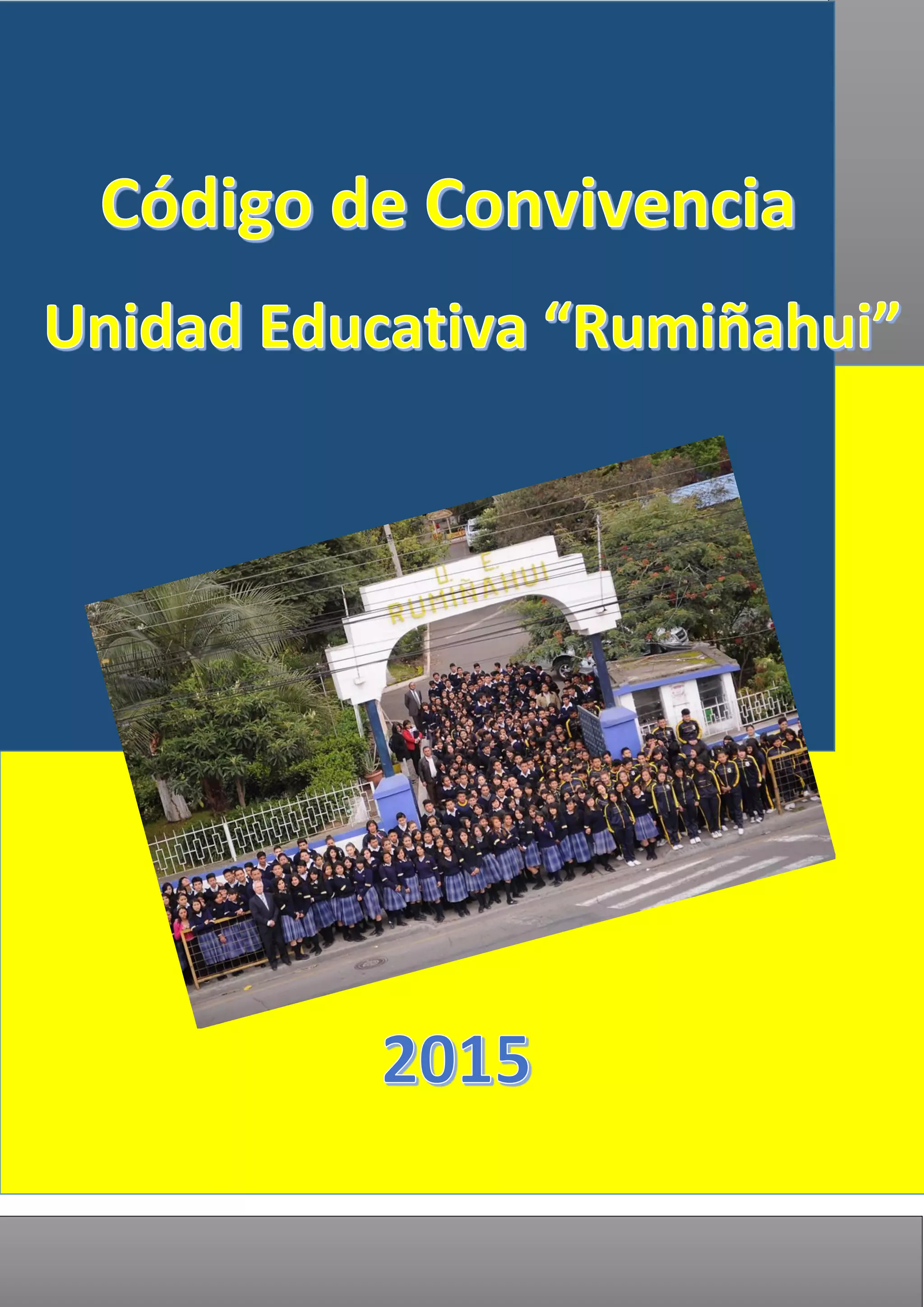 Este documento presenta el código de convivencia de la Unidad Educativa "Rumiñahui". Incluye información sobre la institución como su misión, visión y objetivos. Establece acuerdos y procedimientos para las autoridades, docentes, estudiantes, padres de familia y personal sobre la convivencia armónica. También incluye planes de seguimiento, evaluación y comunicación para promover los valores de la comunidad educativa. El código busca regular las relaciones entre los miembros de la institución basado en principios democráticos y