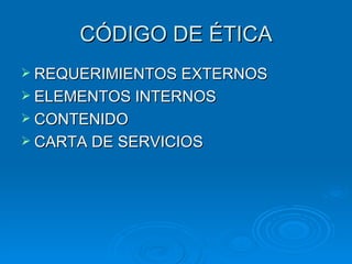 El documento presenta los elementos de un código de ética para el servicio público, incluyendo requisitos externos como el compromiso político y marco legal, y elementos internos como la orientación de funcionarios y condiciones de servicio. Describe los principios fundamentales relativos al servicio público, comportamiento profesional y relación con ciudadanos. Finalmente, presenta una carta de servicios con deberes hacia los ciudadanos.