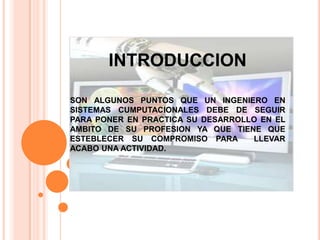 Este documento presenta los principios éticos que un ingeniero en sistemas computacionales debe seguir en el ejercicio de su profesión, incluyendo aceptar la responsabilidad de su trabajo, revelar peligros potenciales asociados con el software, mantener la confidencialidad de la información, garantizar que están cualificados para cada proyecto y seguir los estándares de la industria.