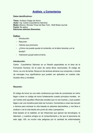 El documento resume y analiza el código de honor propuesto por Carlos Cuauhtémoc Sánchez. Promueve valores como la humildad, lealtad y ética para ayudar a las personas a desarrollar un fuerte carácter y resistir influencias negativas. También discute cómo este código puede ser útil para docentes y familias al enseñar principios morales a los estudiantes y hijos.