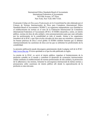 Este documento presenta el Código de Ética para Profesionales de la Contabilidad publicado por el Consejo de Normas Internacionales de Ética para Contadores (IESBA) de la Federación Internacional de Contadores (IFAC). El código establece los requisitos éticos para los profesionales de la contabilidad en todo el mundo y consta de tres partes: Parte A sobre principios fundamentales de ética, Parte B sobre profesionales de la contabilidad en ejercicio y Parte C sobre profesionales de la contabilidad en la empresa. El document