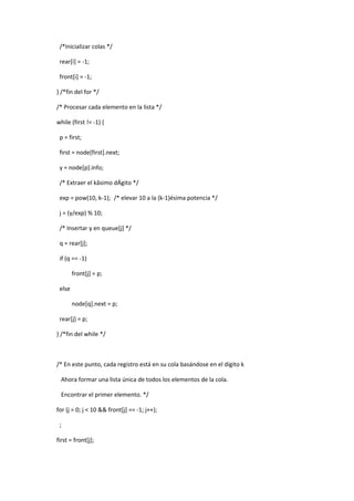 Este documento presenta el algoritmo de ordenamiento por radixtriage (radix sort) para ordenar una lista de números enteros positivos de hasta cuatro dígitos. El algoritmo ordena los números basándose en el valor de cada dígito, de derecha a izquierda, usando colas para almacenar temporalmente los números con el mismo dígito en cada posición. Al final, los números se copian de regreso al arreglo original ya ordenados. El documento incluye la función radixsort() que implementa este algoritmo, así como el programa principal que lee los números
