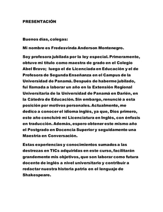 La presentación resume las experiencias y logros educativos de Fredesvinda Anderson Montenegro. Comenzó su carrera como maestra de primaria y obtuvo varios títulos universitarios relacionados con la educación. Actualmente se dedica a estudiar inglés y planea obtener grados adicionales en docencia superior e inglés conversacional para trabajar como profesora de inglés universitaria.