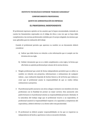 El documento presenta un código de ética para administradores de empresas. Establece normas generales como la obligación de los profesionales de regirse por un código de ética y actuar con independencia, objetividad y transparencia. También cubre temas como la relación con clientes, compañeros y el público en general, así como la responsabilidad de los administradores tanto en el sector público como privado.