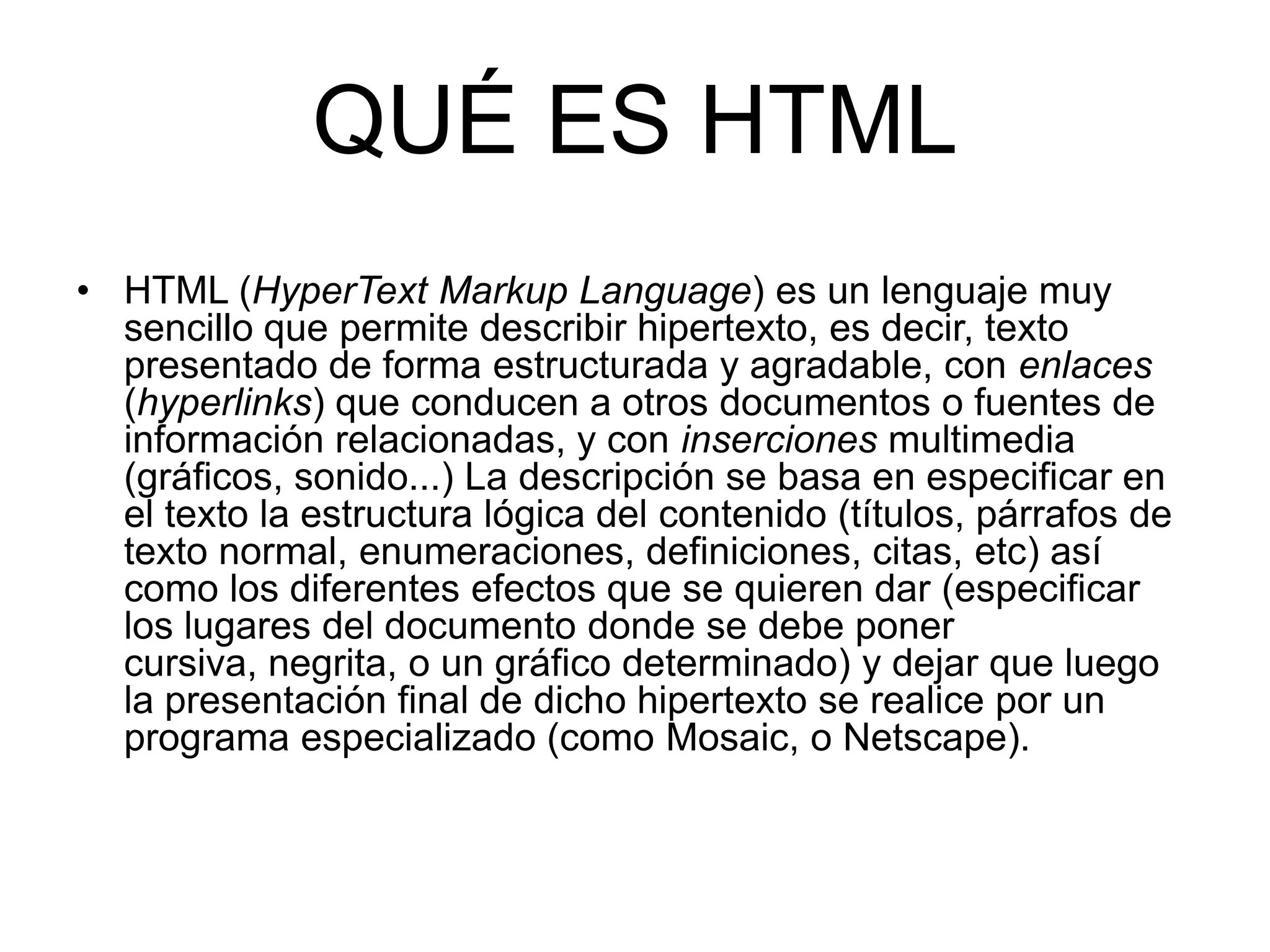 Este documento explica los conceptos básicos de HTML. HTML es un lenguaje que permite crear documentos estructurados con hiperenlaces y multimedia. El documento describe cómo usar etiquetas para especificar la estructura lógica, estilos de texto y efectos como títulos, párrafos, listas y enlaces. También explica la estructura básica de un documento HTML.