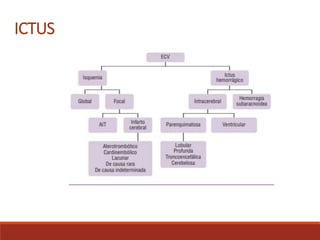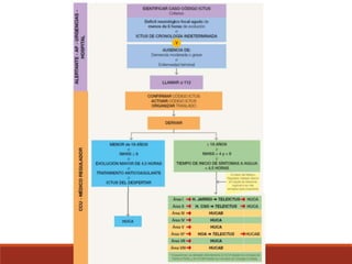 Este documento establece el procedimiento para la atención de pacientes con ictus, incluyendo los criterios para activar el código ictus, el protocolo de evaluación y tratamiento, así como la derivación a centros de referencia. Se describen los pasos a seguir desde la identificación del paciente, la confirmación del diagnóstico, el tratamiento inicial y las pruebas complementarias requeridas para determinar el tratamiento más adecuado.