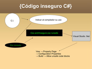 Este documento proporciona información sobre código inseguro en C#. Explica que el código inseguro permite usar punteros para referenciar direcciones de memoria, lo que agiliza el manejo de arreglos y llamadas a funciones con parámetros punteros. También indica cómo compilar código inseguro en Visual Studio mediante las opciones /unsafe en la línea de comandos o permitiendo bloques de código inseguro en las propiedades de compilación.