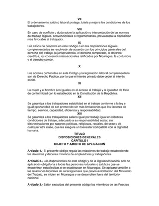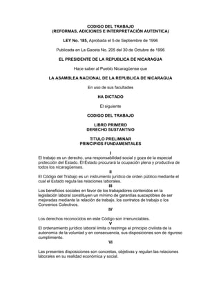 Este documento presenta el Código del Trabajo de Nicaragua, el cual regula las relaciones laborales en el país. El código establece los derechos y obligaciones mínimos de trabajadores y empleadores. También cubre temas como contratos laborales, jornadas de trabajo, salarios, seguridad social y otros derechos de los trabajadores. El código tiene como objetivo principal proteger y mejorar las condiciones de los trabajadores nicaragüenses.