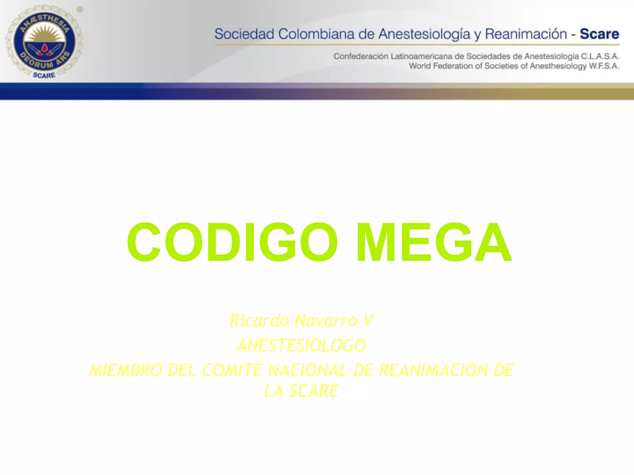 El documento habla sobre el Código Mega, que es una simulación de paro cardíaco donde los estudiantes practican el soporte vital cardíaco avanzado en equipo. Describe los pasos de la cadena de supervivencia, incluyendo la reanimación cardiopulmonar temprana, la desfibrilación temprana y el soporte avanzado temprano. También discute los roles del equipo, errores comunes y la importancia del análisis crítico después del episodio.
