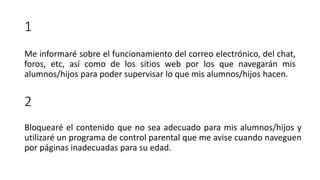 Este documento proporciona un decálogo de 10 puntos para promover el uso seguro y responsable de Internet entre los alumnos/hijos. Incluye recomendaciones como supervisar la navegación en línea de los niños, bloquear contenido inapropiado, enseñarles a crear cuentas de correo electrónico de forma segura y recordarles que no compartan información personal con desconocidos. También recomienda no dejar a los niños solos frente a la pantalla, fomentar un uso educativo de Internet y estar