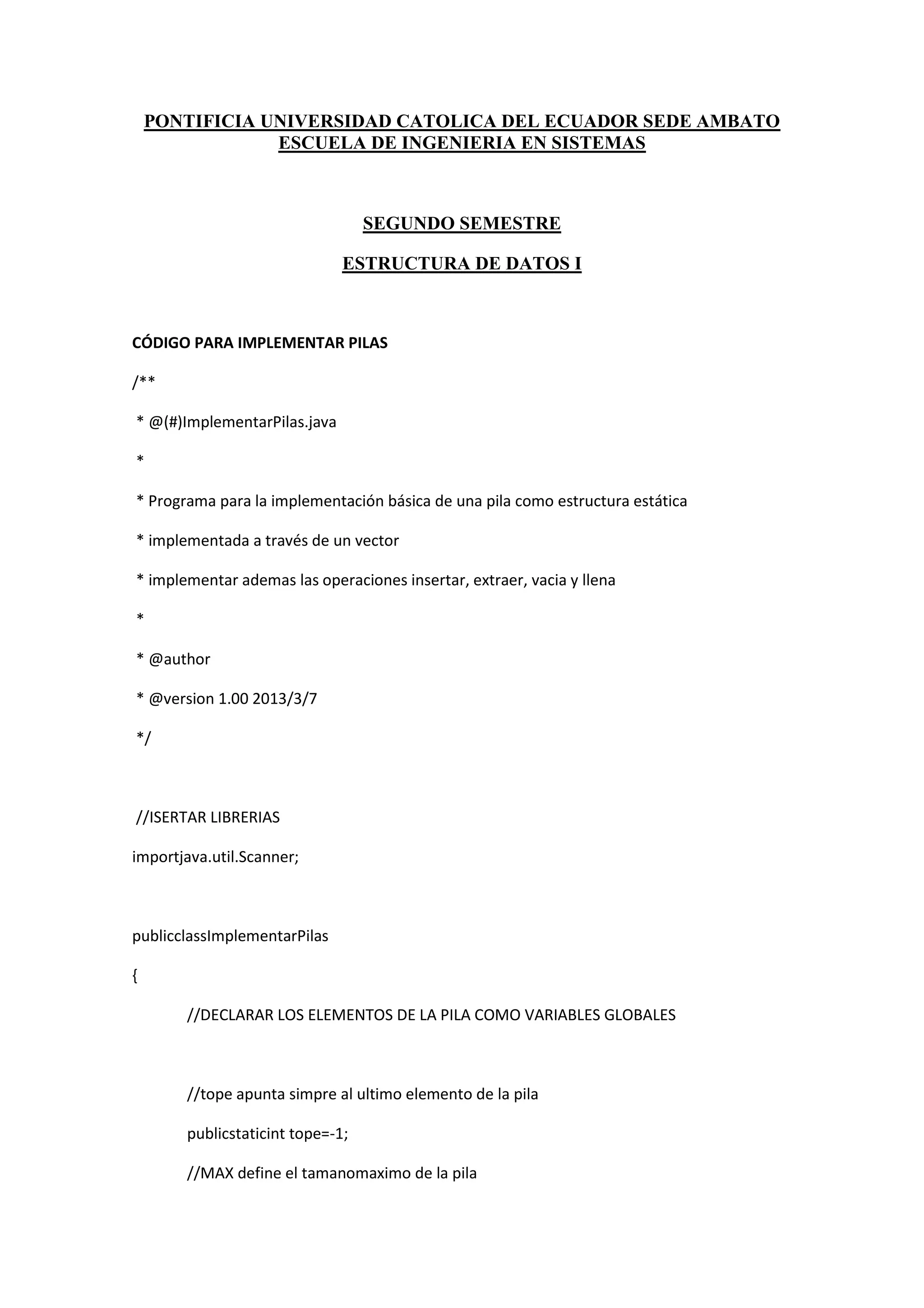 Este código implementa una pila como estructura de datos estática utilizando un vector. Define métodos para insertar, extraer y verificar si la pila está vacía o llena. Usa un vector de tamaño fijo MAX para almacenar los elementos de la pila y una variable tope para apuntar al último elemento. El método main realiza pruebas insertando y extraendo elementos y verificando el estado de la pila.