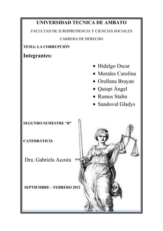 Este documento trata sobre la corrupción en Ecuador. Define la corrupción y explica que aunque no está tipificada como un delito en sí misma, a menudo implica delitos como cohecho, peculado, prevaricato y evasión de impuestos. Explica las sanciones para estos delitos relacionados con la corrupción según el código penal ecuatoriano. Finalmente, concluye que para erradicar la corrupción se necesita implementar una nueva cultura política donde el interés nacional prime sobre los intereses particulares.