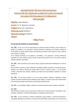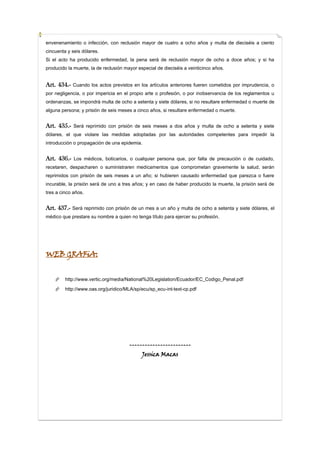 Este documento resume varios artículos del Código Penal de Ecuador relacionados con delitos contra la salud pública, incluyendo la adulteración y falsificación de alimentos y bebidas, la propagación de enfermedades contagiosas, el envenenamiento de aguas y alimentos, y las sanciones para médicos y farmacéuticos que pongan en peligro la salud de los pacientes. Los artículos describen las penas por prisión y multas para individuos que cometan estos delitos, las cuales varían dependiendo de si causan