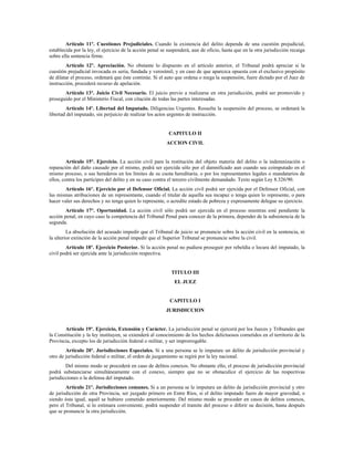 Este documento presenta el Código Procesal Penal de la provincia de Entre Ríos. Establece las garantías constitucionales de los acusados, la aplicación temporal de las leyes procesales penales y los principios de interpretación restrictiva e in dubio pro reo. Además, define la naturaleza pública de la acción penal, las competencias del Ministerio Público, los Jueces y Tribunales en materia penal.