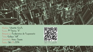 Este documento presenta información sobre códigos QR. Explica que los códigos QR son códigos bidimensionales creados en 1994 por Denso Wave para almacenar información de forma rápida. Detalla los tipos de datos que pueden almacenarse, como texto, direcciones web, contactos y más. Además, cubre las capacidades de almacenamiento y corrección de errores de los códigos QR y sus usos diversos más allá de la industria automotriz, incluyendo publicidad, marketing y diseño gráfico.