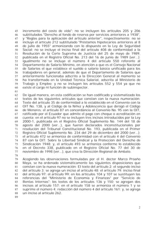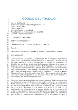 Este documento presenta una codificación del Código del Trabajo de Ecuador realizada por la Comisión de Legislación y Codificación del Congreso Nacional. La codificación actualiza la legislación laboral del país para mantenerla acorde con la Constitución, convenios de la OIT ratificados por Ecuador y otras leyes. Se excluyeron algunos artículos derogados y se reorganizaron y sistematizaron otros para armonizarlos con tratados internacionales y resoluciones judiciales. El objetivo final es mantener un Código del Trabajo vigente que