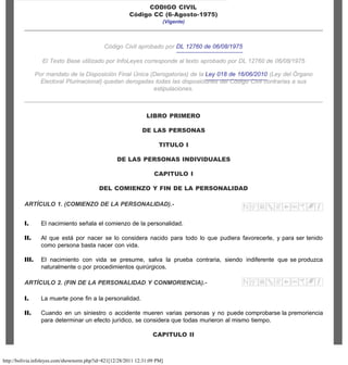 Este documento presenta un resumen del Código Civil de Bolivia. Establece normas sobre personas, incluyendo el comienzo y fin de la personalidad, capacidad jurídica, mayoría de edad, incapacidad de obrar, derechos de la personalidad como el nombre, la libertad personal, la imagen y el honor. También cubre temas de domicilio y ausencia, estableciendo normas para la declaración de ausencia y posesión provisional de bienes de una persona ausente.