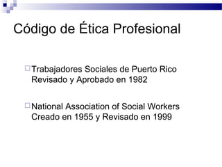 El documento resume los Códigos de Ética del Trabajo Social de Puerto Rico y la Asociación Nacional de Trabajadores Sociales de Estados Unidos (NASW). Ambos códigos cubren seis áreas similares relacionadas con la responsabilidad del trabajador social hacia la sociedad, la profesión, los clientes, compañeros, agencia e institución. Los códigos enfatizan valores como la dignidad humana, justicia social y no discriminación.