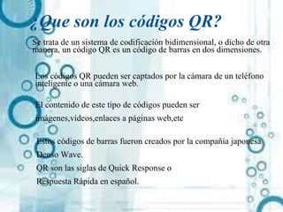 El documento habla sobre códigos QR. Explica que los códigos QR son códigos de barras bidimensionales que pueden ser escaneados por cámaras de teléfonos inteligentes y que contienen enlaces, imágenes o videos. Fueron creados por la compañía japonesa Denso Wave y su nombre significa Respuesta Rápida. Se caracterizan por su forma cuadrada y los cuadros en las esquinas. Hoy en día se usan comúnmente en publicidad, marketing y diseño gráfico.