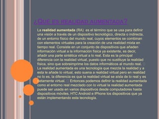 La realidad aumentada (RA) es una tecnología que combina elementos virtuales con el mundo real a través de dispositivos como smartphones y computadoras, ofreciendo una experiencia interactiva en tiempo real. Se utiliza en diversas aplicaciones, como la identificación de monumentos y la extracción de información adicional sobre el entorno, destacando aplicaciones como Wikitude y Car Finder. Se clasifica en dos tipos principales: basada en marcadores o imágenes y basada en la posición, cada una empleando diferentes métodos para integrar información virtual con la realidad.
