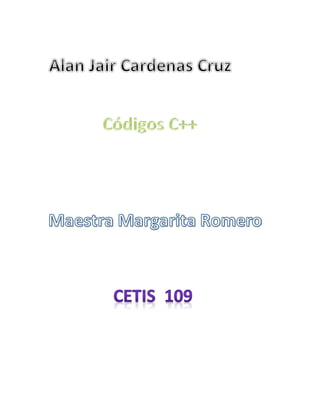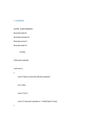 Este documento contiene 35 programas en C++ escritos por Alan Cárdenas para calcular áreas, perímetros, volúmenes de figuras geométricas básicas y realizar conversiones de unidades de longitud y tiempo. Los programas solicitan al usuario que ingrese los valores relevantes de cada figura o unidad y luego imprimen el resultado del cálculo correspondiente.