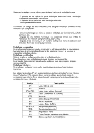 El documento describe los sistemas de códigos utilizados para designar diferentes tipos de embalajes y envases, incluyendo códigos para embalajes exteriores, únicos, compuestos e interiores. También describe símbolos normalizados por la ISO para indicar instrucciones de manipulación en los embalajes.