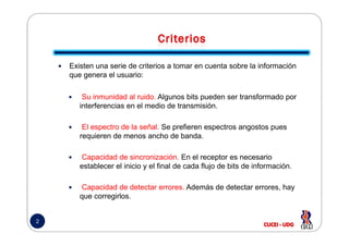 El documento describe varios criterios para codificar señales de información generadas por usuarios, incluyendo su inmunidad al ruido, espectro y capacidad de sincronización y detección de errores. La solución es codificar la señal usando un codificador de canal para agregar redundancia y permitir la detección y corrección de errores. Se describen varios códigos de línea comunes como NRZ, AMI, Manchester y sus ventajas y desventajas.